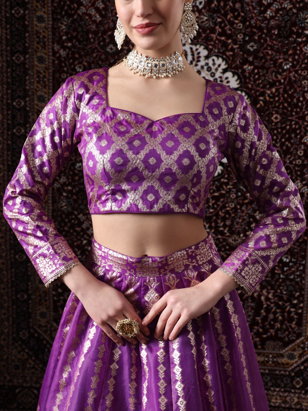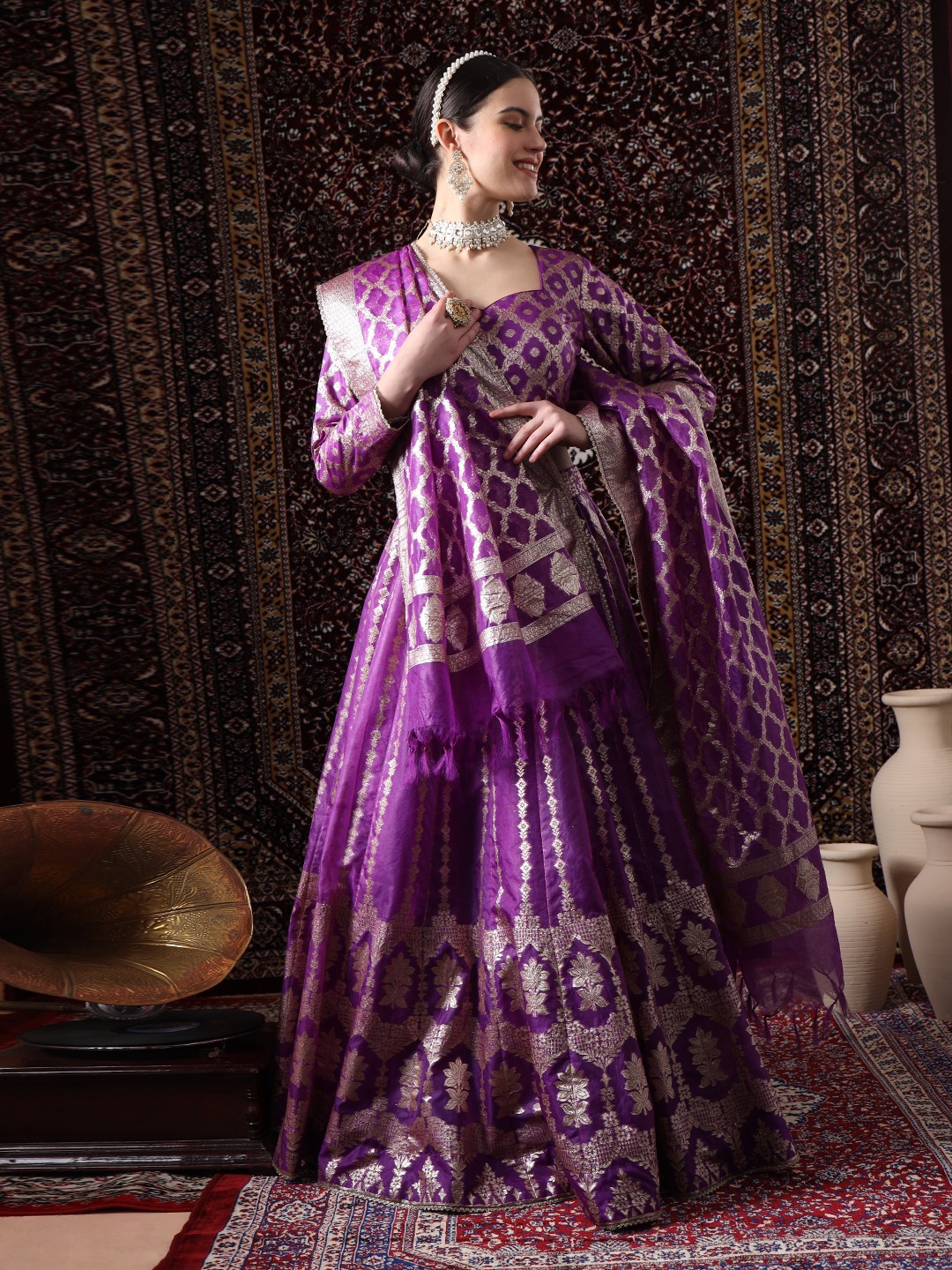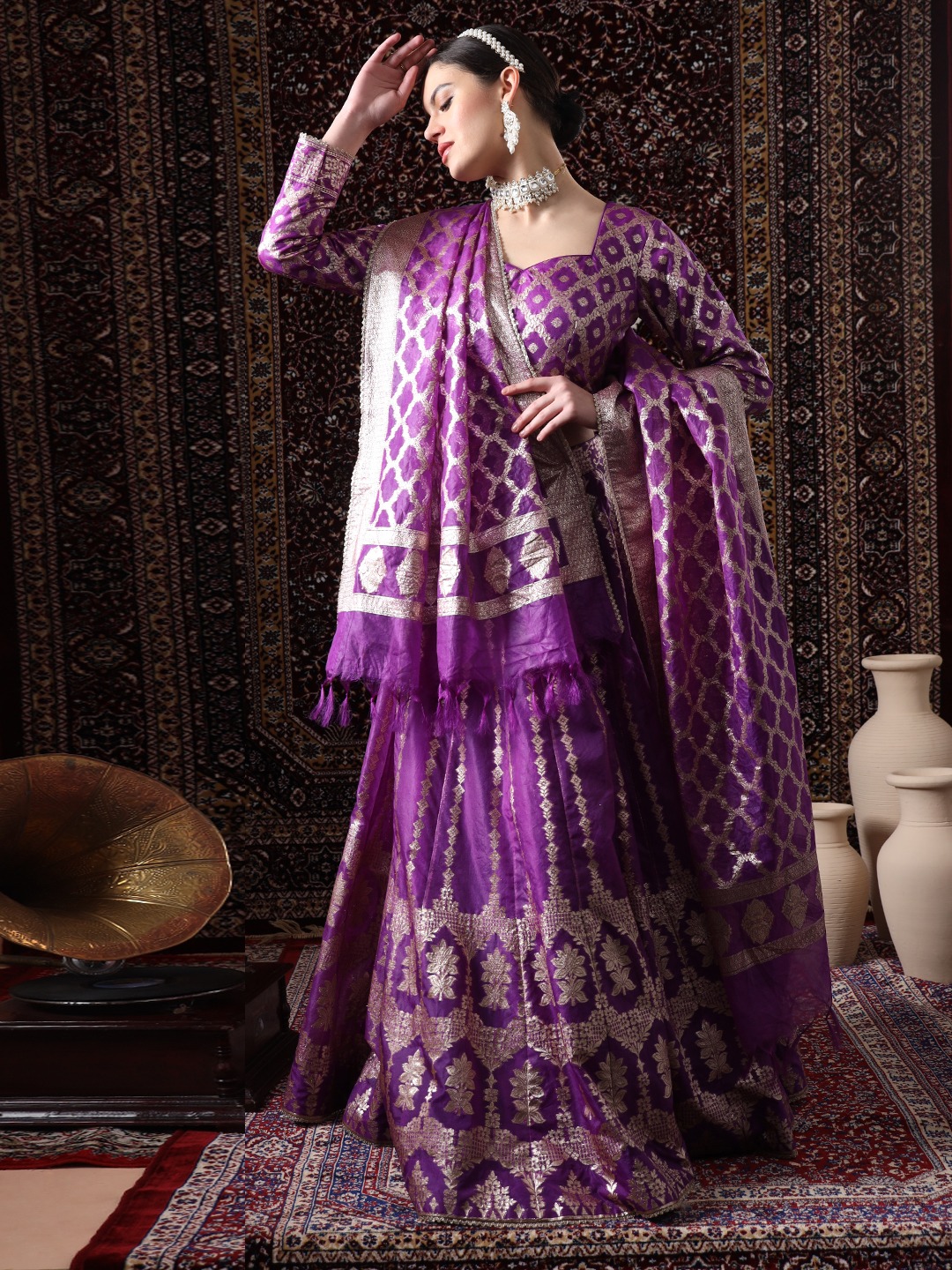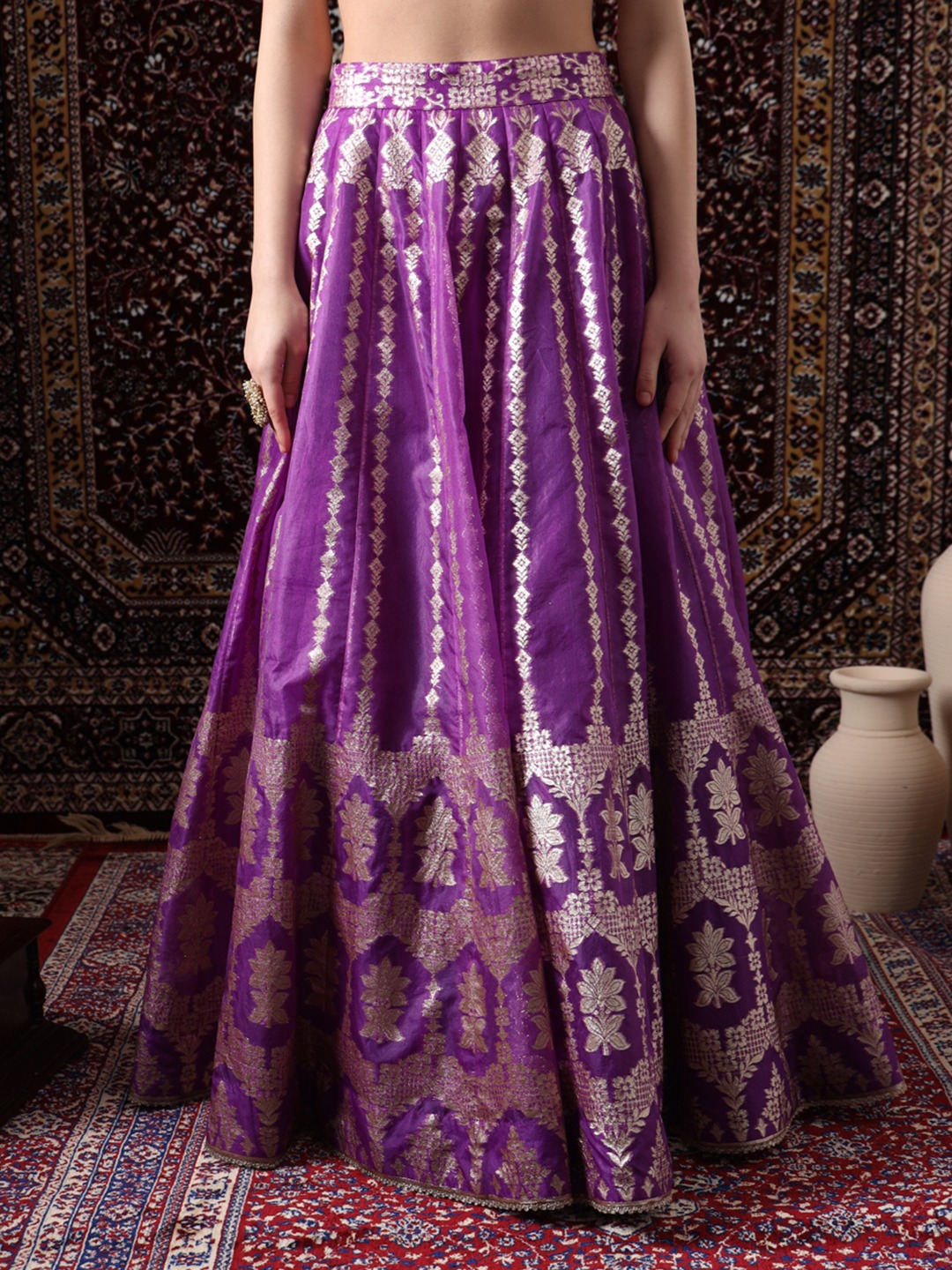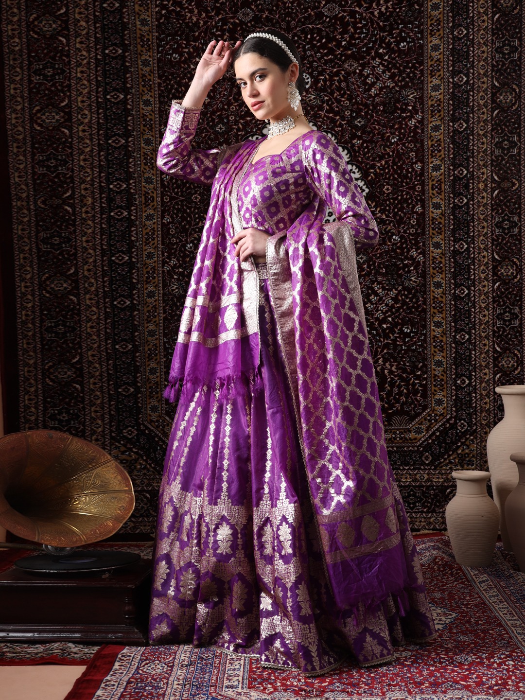 Step into a world of regal elegance with the Readymade “Majestic Mirage”. This exquisite ensemble is a masterpiece of craftsmanship, featuring a rich, regal purple hue that exudes sophistication and grace. The lehenga skirt is crafted from luxurious silk, adorned with intricate Mat golden work that weaves a mesmerizing tapestry of floral motifs. The sheer dupatta, delicately embellished with the same mat golden work, adds a touch of ethereal beauty, while the full-sleeved blouse completes the ensemble with its elegant design.