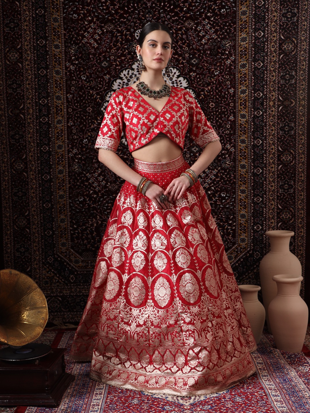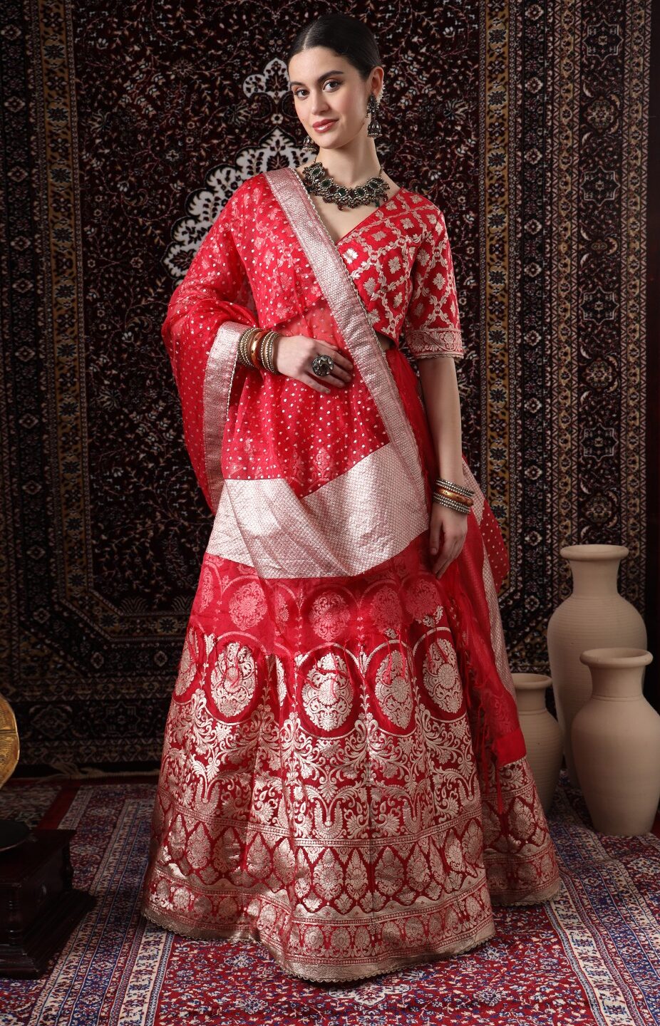 Indulge in the regal allure of our Readymade “Royal Crimson” lehenga. This stunning ensemble, draped in a rich, crimson red, exudes elegance and opulence. The flowing lehenga skirt, adorned with intricate Krishadha’s work and intricate motifs, is a masterpiece of craftsmanship. Paired with a matching choli and a flowing dupatta, this set is perfect for a royal wedding or a grand celebration.